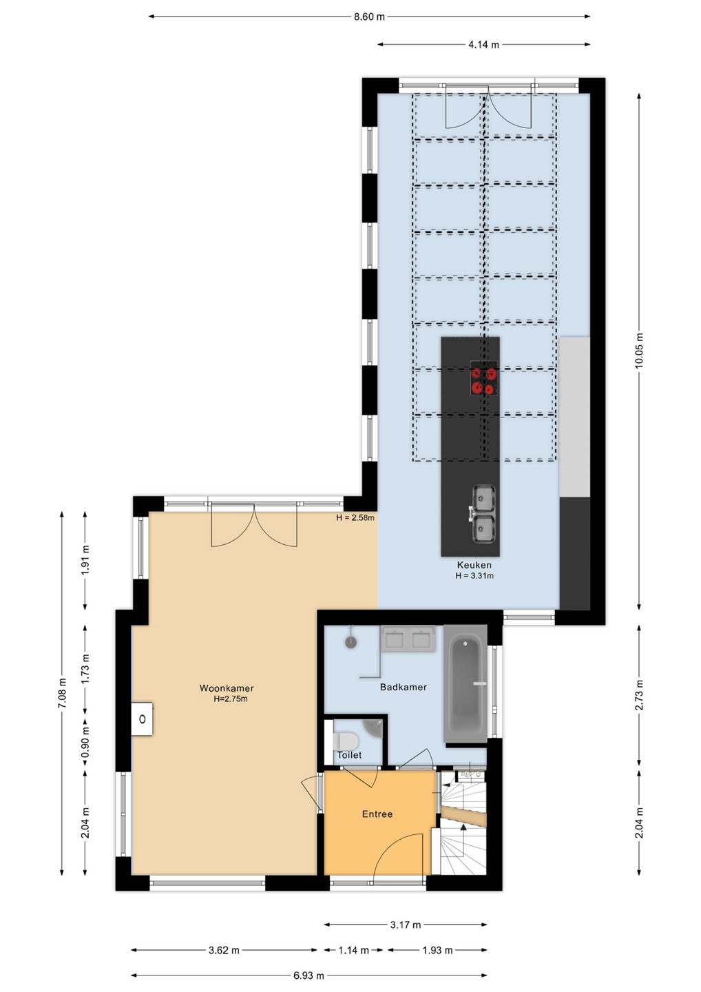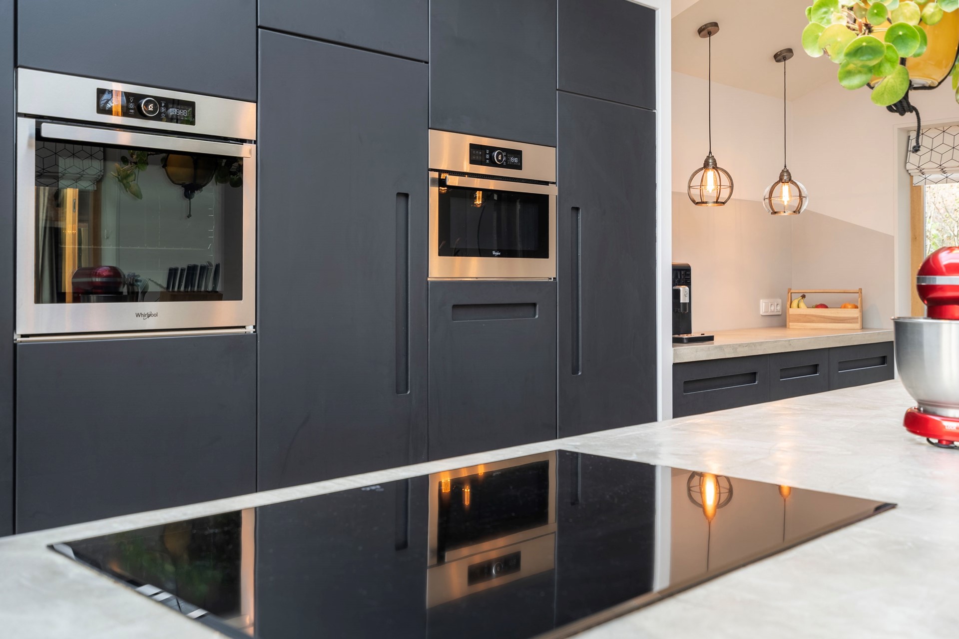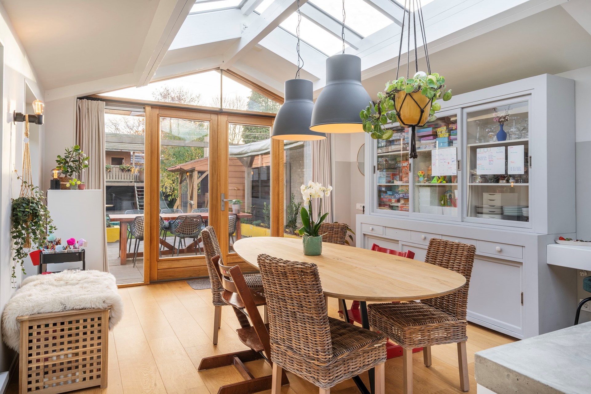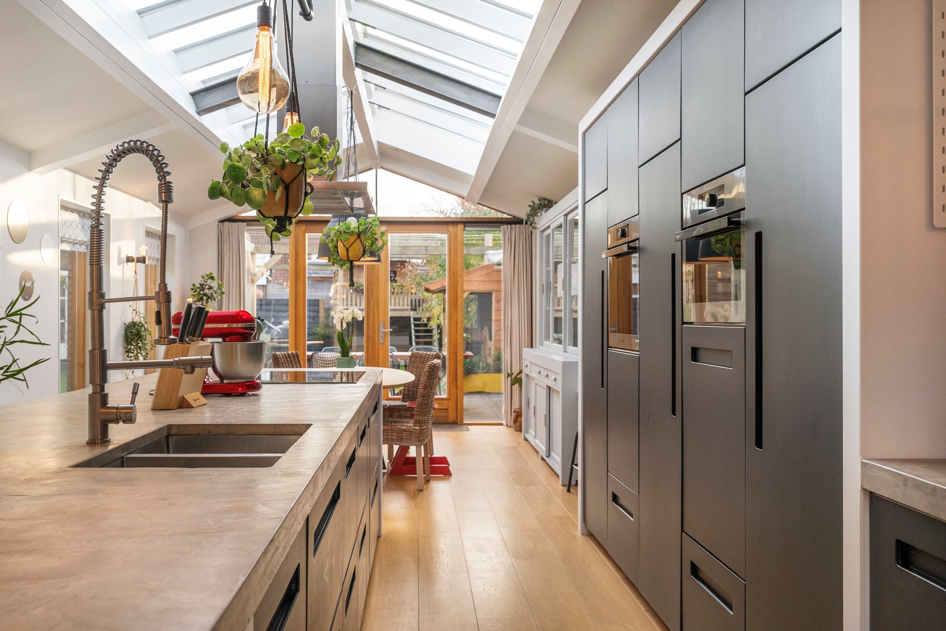 De grote glazen geeft prachtig zicht op de achtertuin en laat veel daglicht binnen. Een pelletkachel voegt een gezellige warmte toe aan de woonkamer, ideaal voor de koudere maanden. In de ruime leefkeuken nodigt het indrukwekkende kookeiland van vier meter uit tot culinaire avonturen. De aanbouw wordt gekenmerkt door een zes meter lange lichtstraat, waardoor je 's avonds zelfs de sterren kunt bewonderen. Om boven ruimte te behouden voor meerdere slaapkamers, is op de begane grond een badkamer gerealiseerd. Deze moderne ruimte is voorzien van een ligbad, een inloopdouche en dubbele wastafel. Vloerverwarming in de badkamer, het toilet en de aanbouw zorgt voor lekker warme voeten bij de start van je dag.