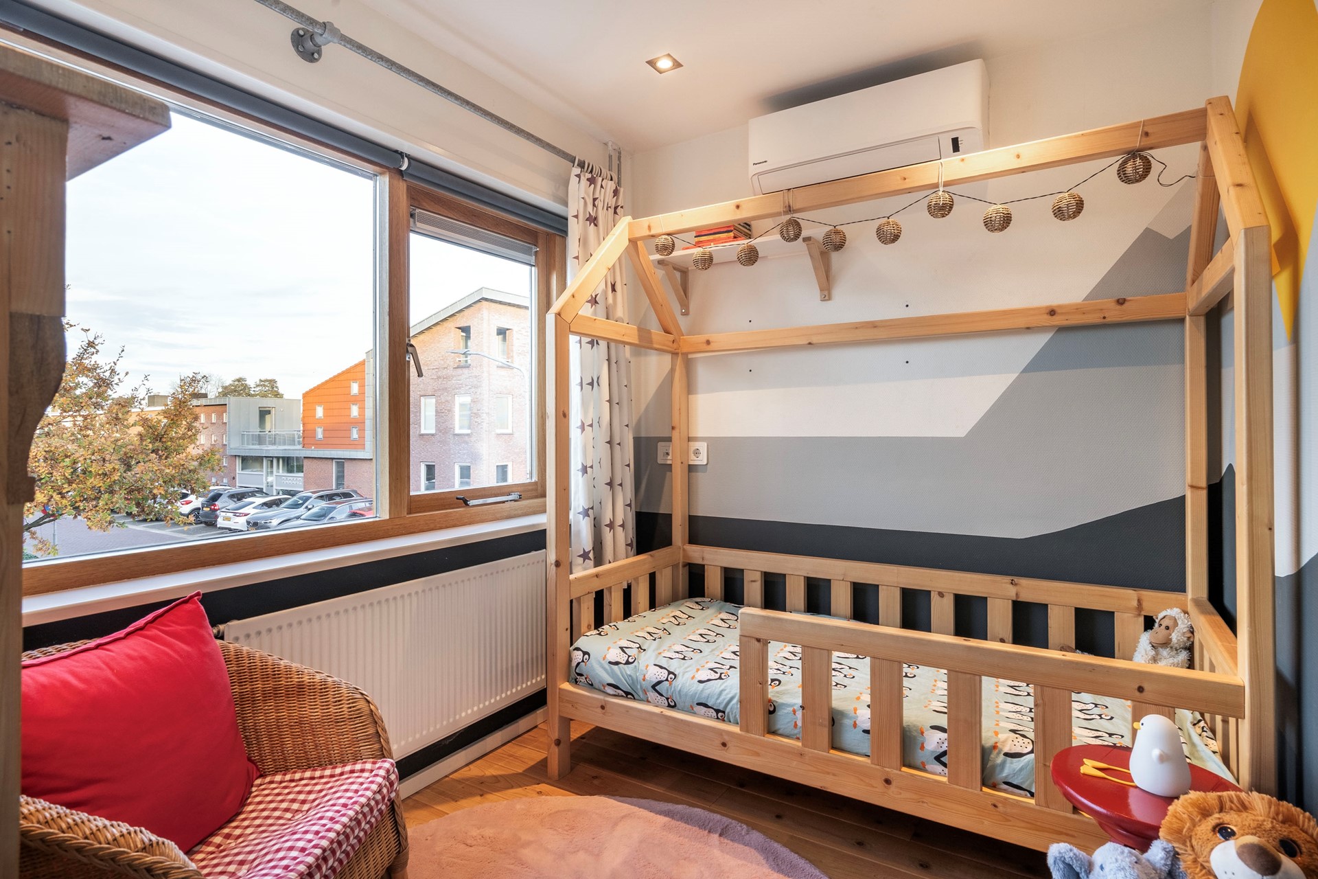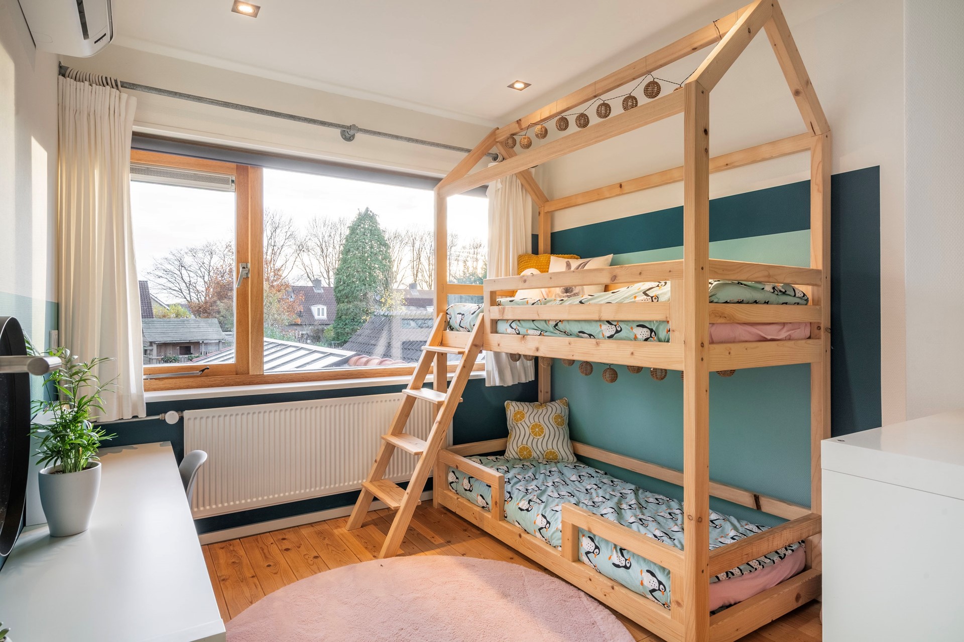 Op de eerste verdieping vind je drie fijne slaapkamers, waarvan de ramen zijn voorzien van rolluiken. Bovendien is er airconditioning, die de verdieping koelt. Hier kun je genieten van een goede nachtrust, ongeacht het seizoen.