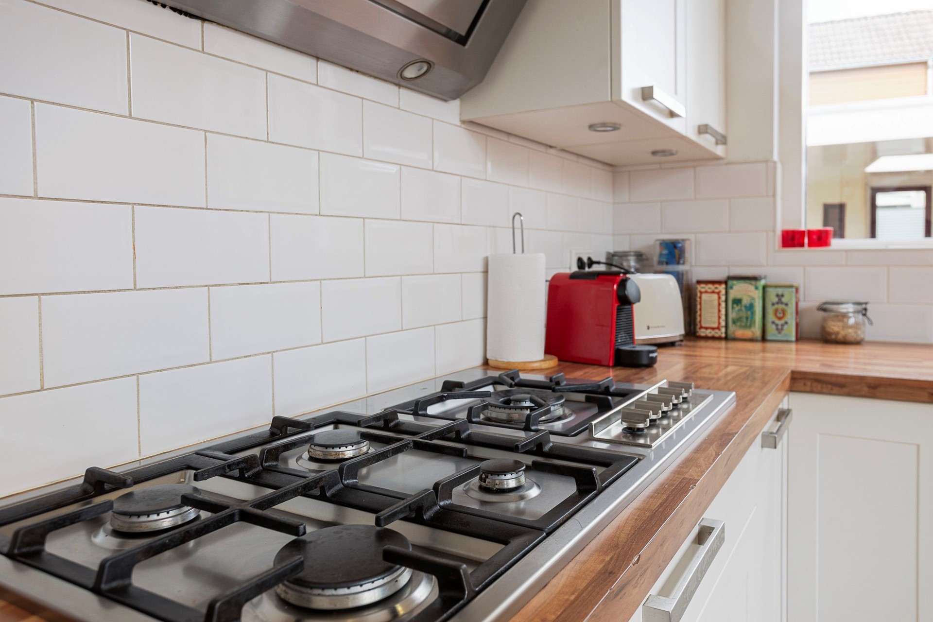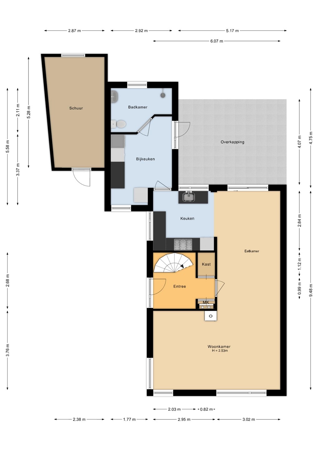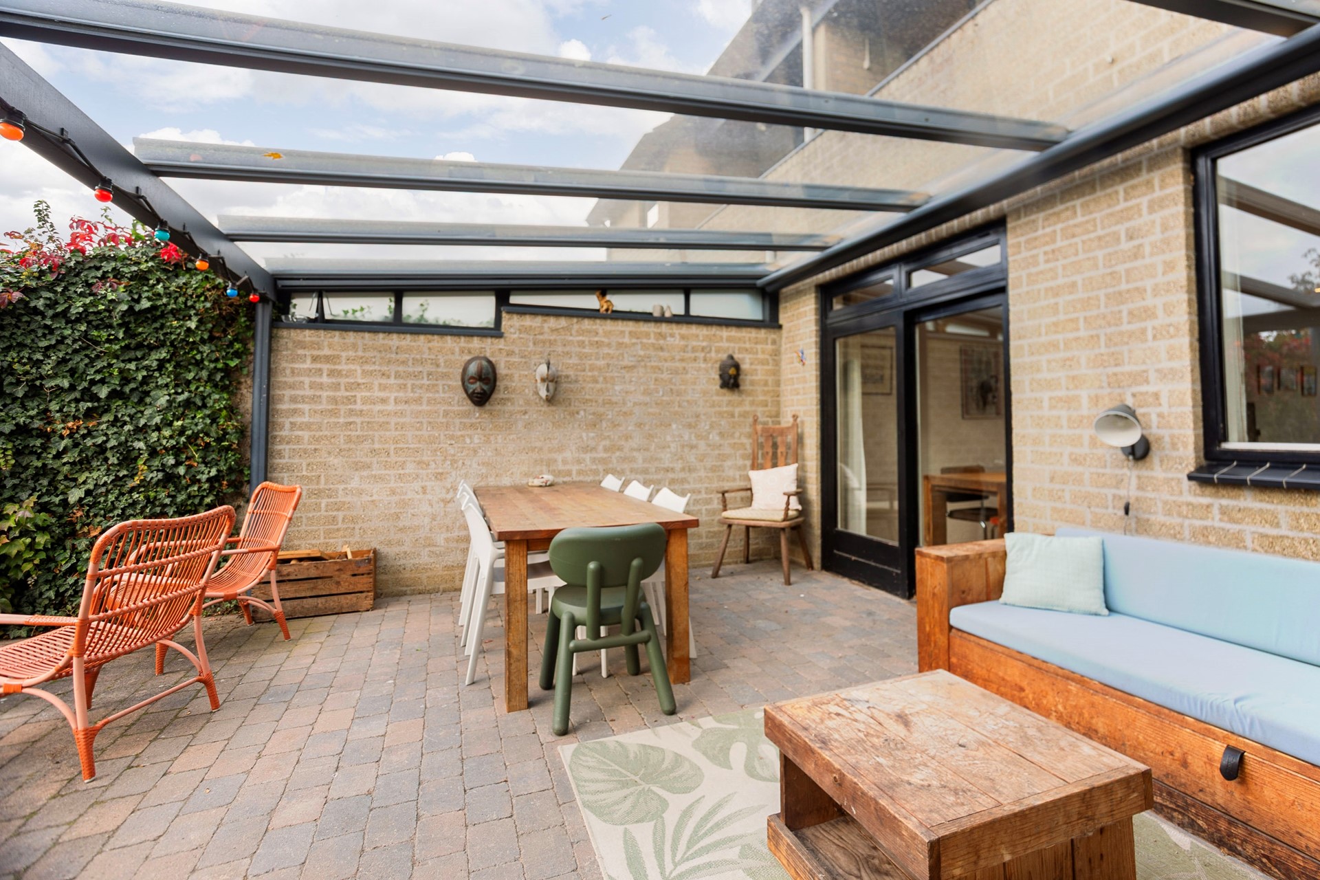 Bij binnenkomst word je verwelkomd in een ruime hal die toegang biedt tot de lichte en grote L-woonkamer. Hier kun je heerlijk ontspannen bij de houtkachel, terwijl de airconditioning zorgt voor een aangename temperatuur in de zomer. De halfopen keuken is praktisch ingericht en voorzien van alle moderne gemakken. De begane grond biedt ook een bijkeuken met plek voor de wasmachine en droger en een tweede badkamer, ideaal voor gasten of een druk gezin. Vanuit de eetkamer stap je via de schuifpui zo de grote achtertuin in, met een overkapping waar je het hele jaar door van het buitenleven kunt genieten.