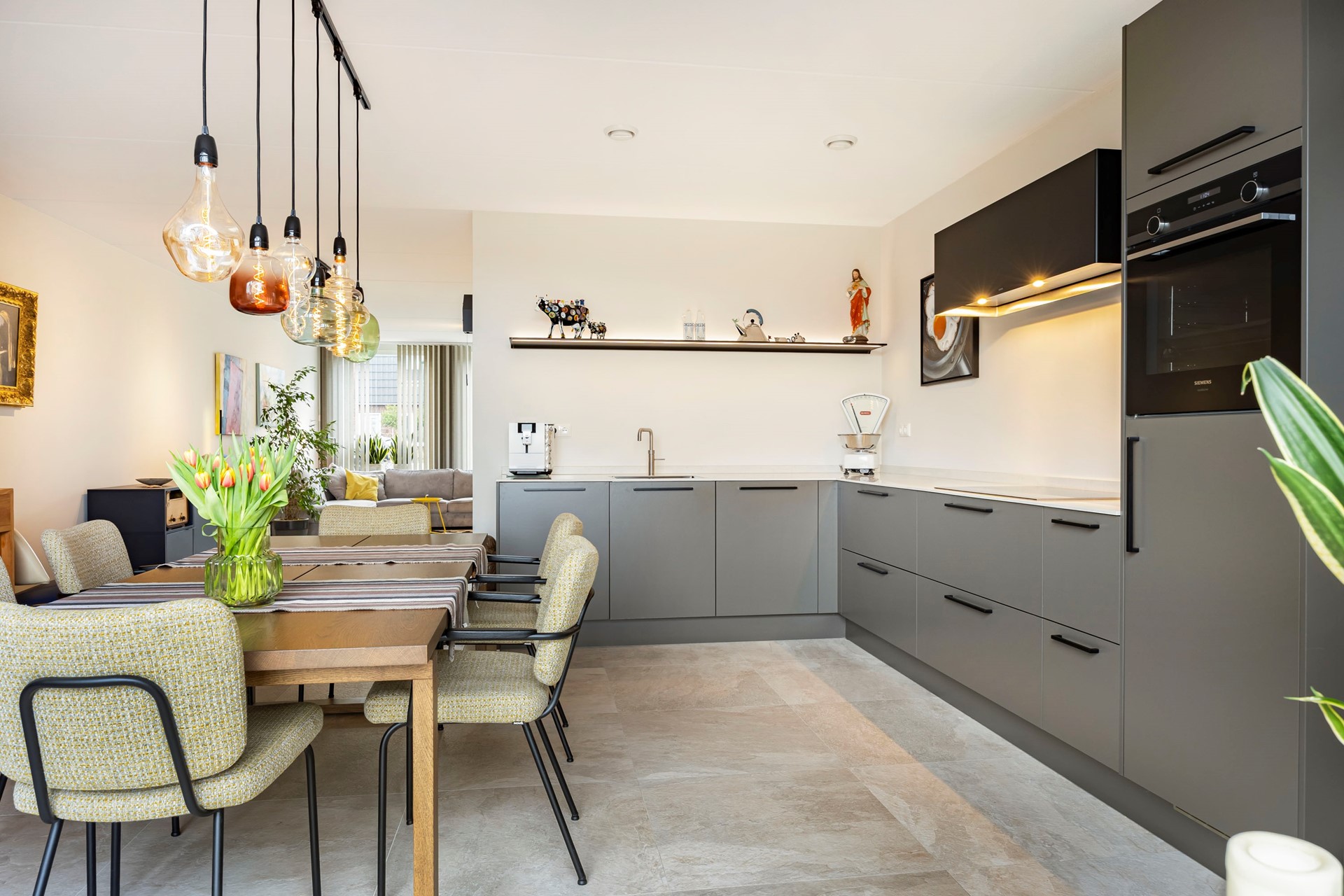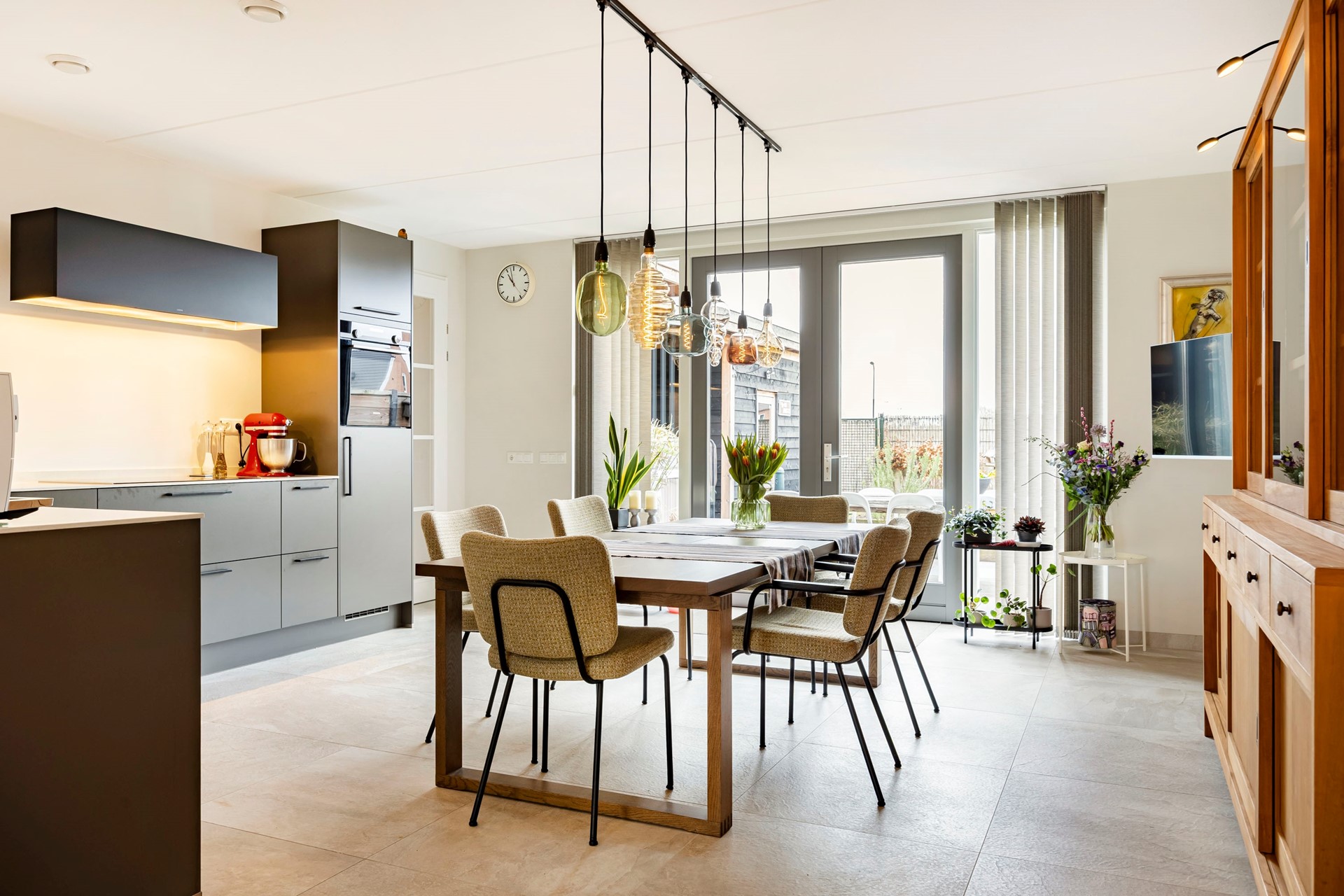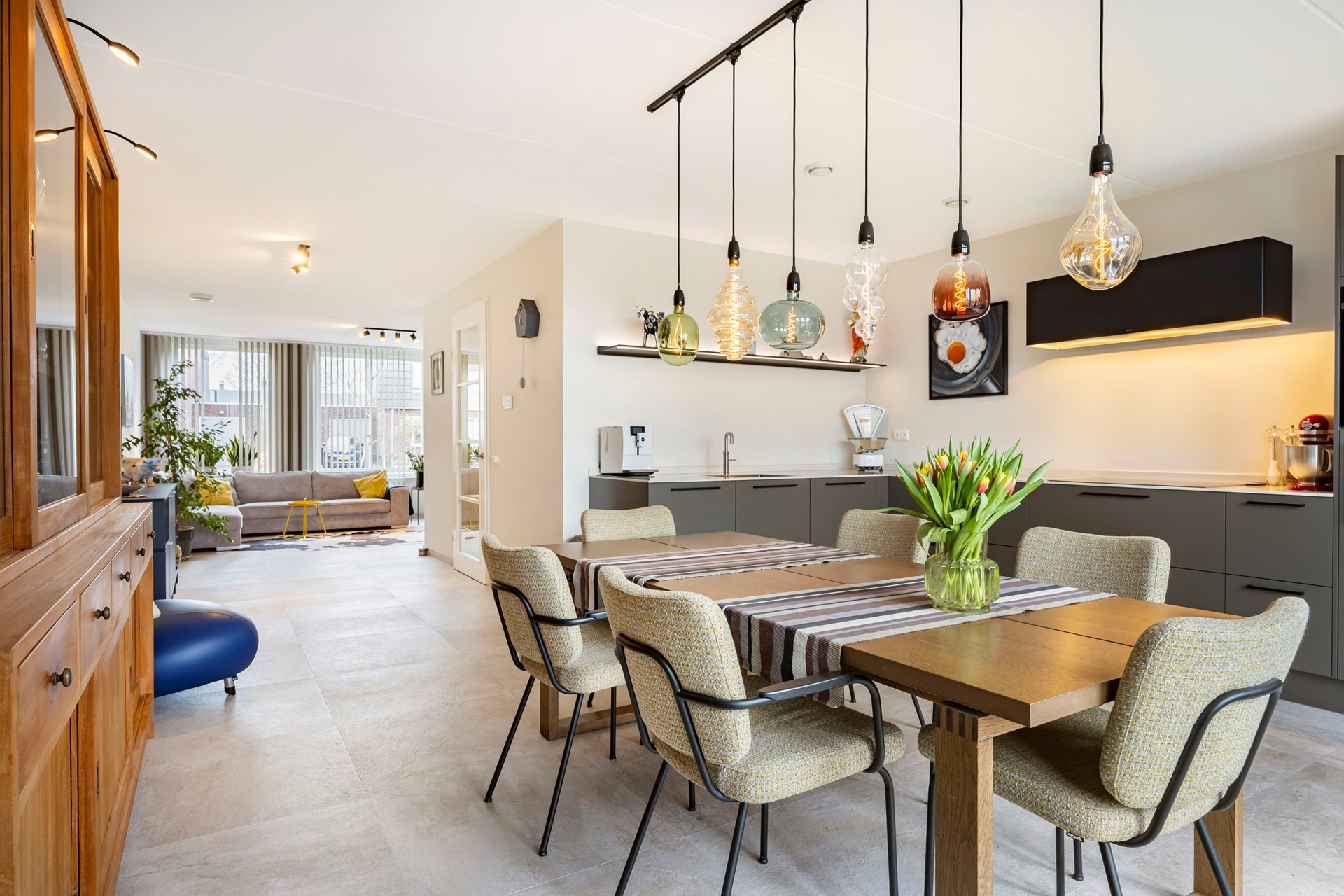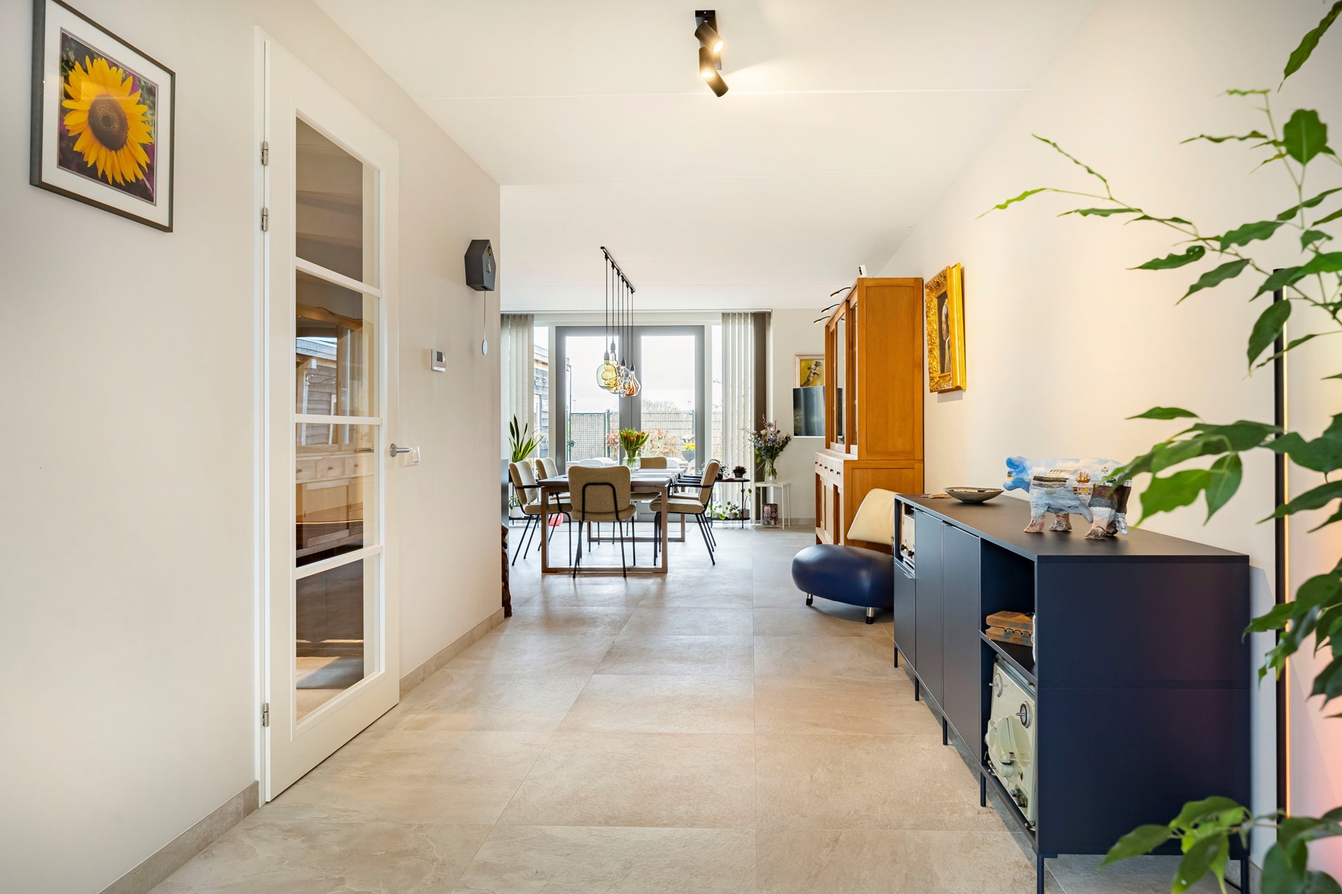 Bij binnenkomst word je verwelkomd in een hal die toegang biedt tot de lichte en ruime woonkamer. De tegelvloer met vloerverwarming zorgt ervoor dat je zelfs op de koudste dagen warme voeten houdt. Aan de achterzijde vind je de open woonkeuken die direct grenst aan de tuin. De keuken is voorzien van alle gemakken. Hier kun je heerlijk koken terwijl je geniet van het uitzicht op de fraai aangelegde tuin. De bijkeuken en inpandige berging bieden plek voor witgoed en extra opbergruimte.