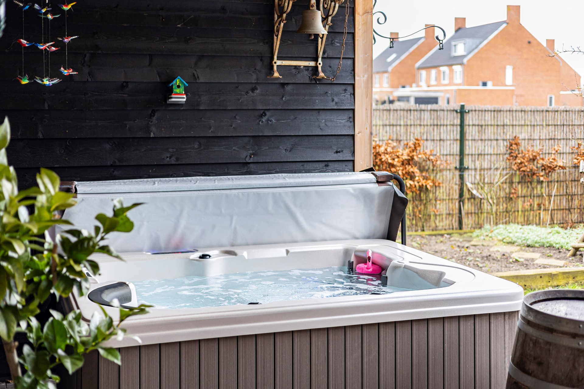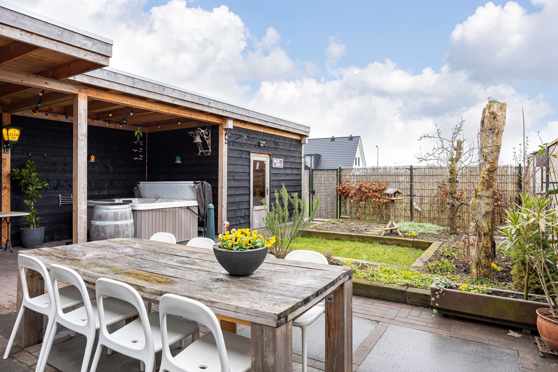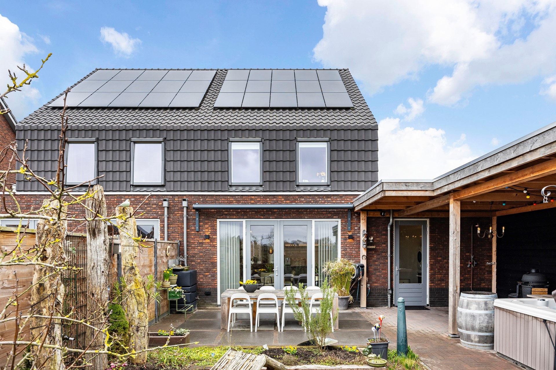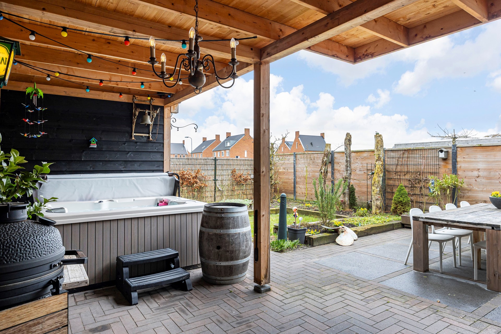 De tuin is een heerlijke plek om tot rust te komen. Met een oppervlakte van bijna 66 m² is er genoeg ruimte voor een gezellige barbecue of een ontspannen middag in de zon. De schuur met overkapping biedt extra privacy en houdt de wind tegen. Dankzij de eigen wellness met buitendouche en massagebad, geniet je hier van luxe en comfort.