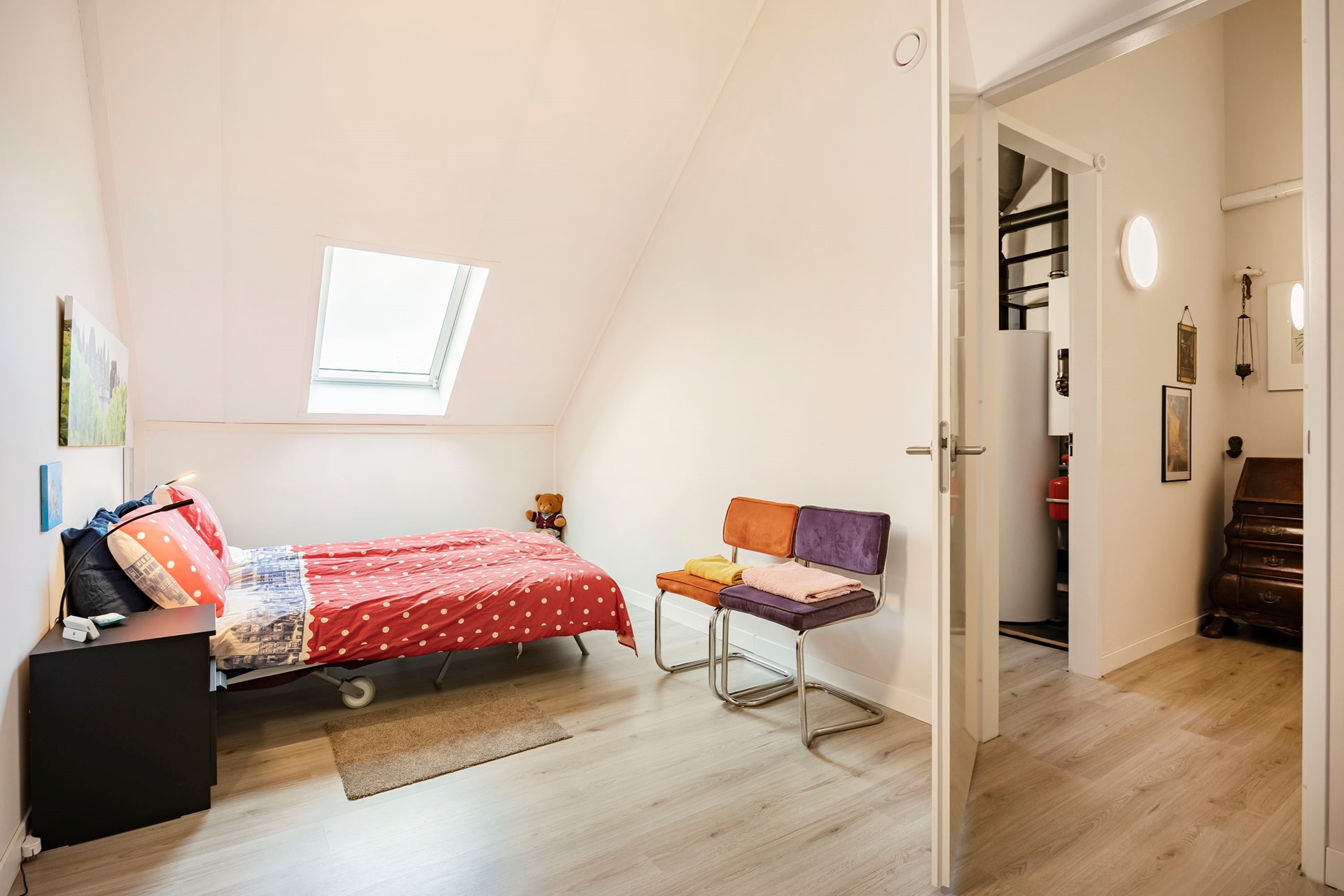 De zolderverdieping is een verrassend ruime plek die je naar eigen wens kunt inrichten. Of je nu een extra slaapkamer, een speelruimte voor de kinderen of een thuiskantoor nodig hebt, hier kan het allemaal. De mogelijkheden zijn eindeloos. Op deze verdieping vind je ook de technische ruimte met daarin de zaken die dit huis zo energiezuinig maken: de warmtepomp, WTW en de boiler, met maar liefst 300 liter warm water.