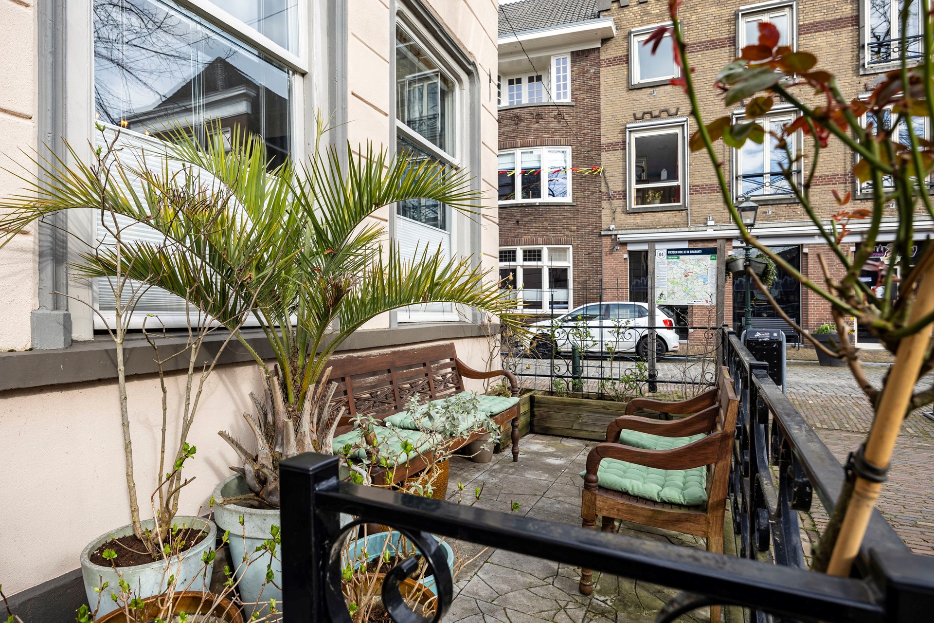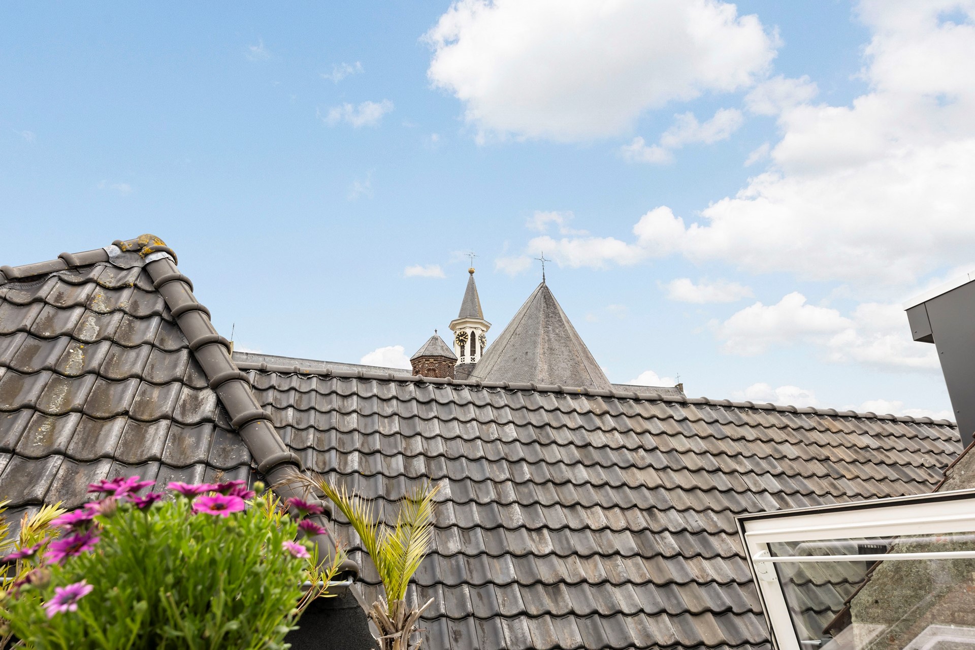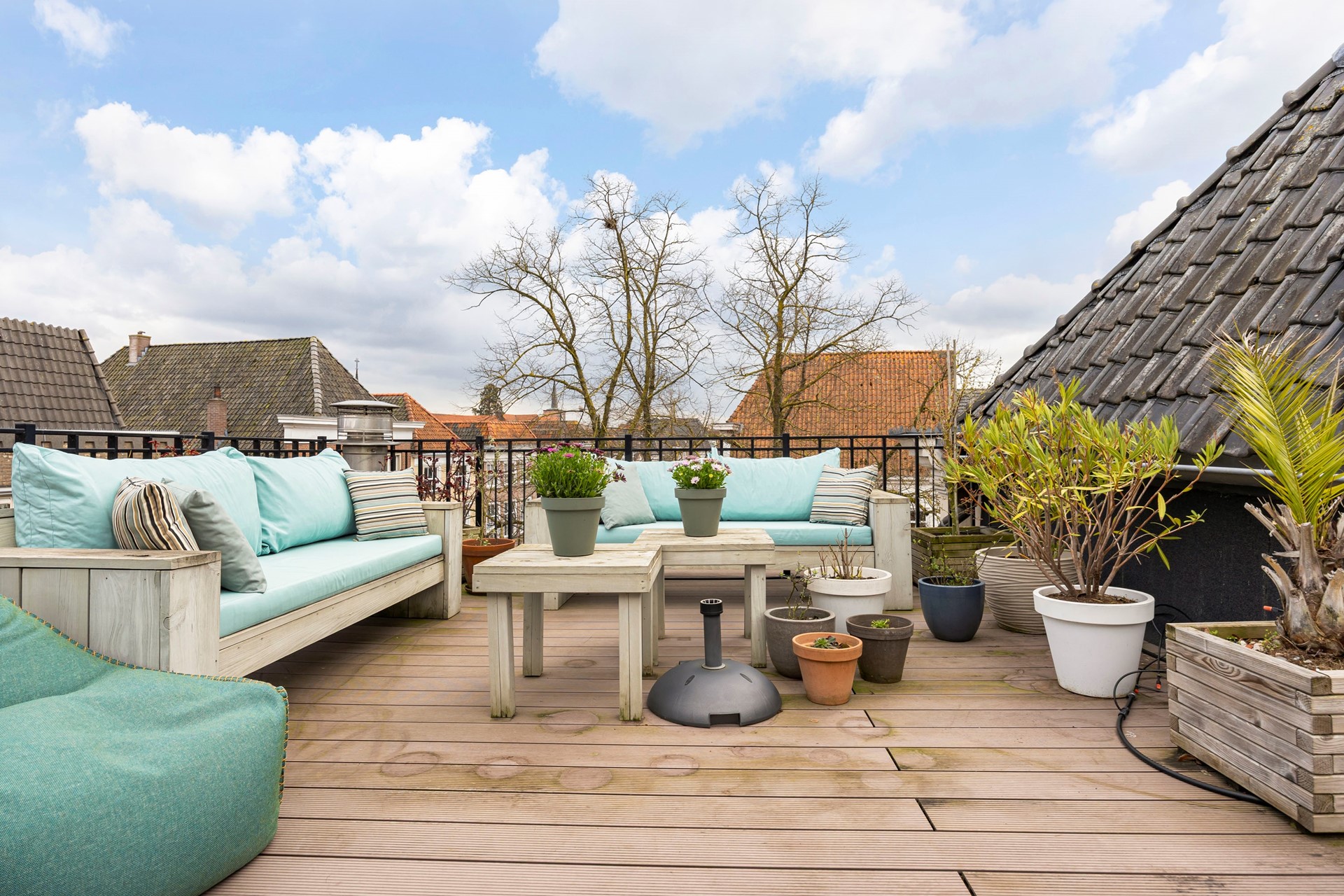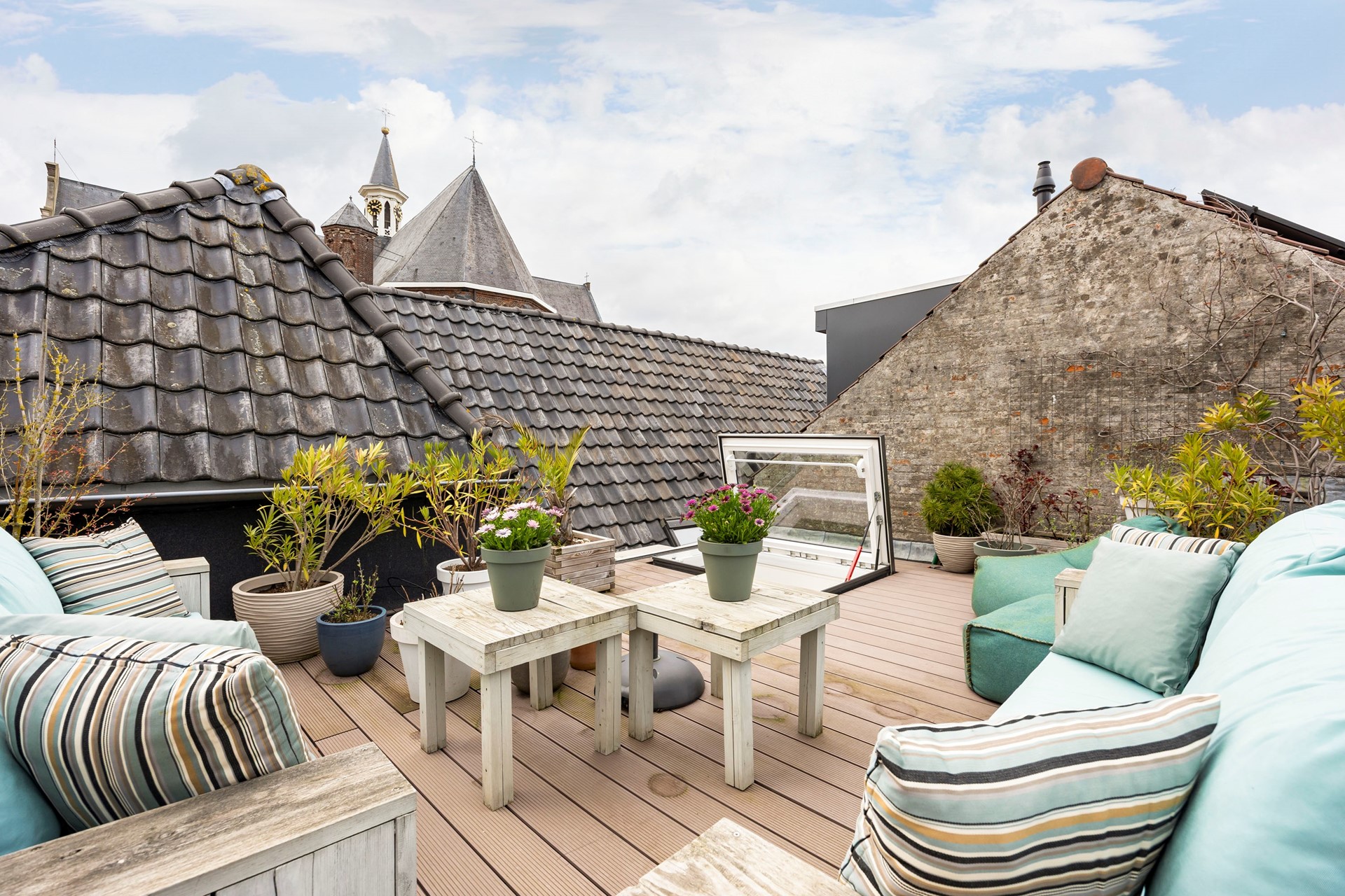 Buiten verrast dit huis ook. Aan de voorzijde ligt een afgezette voortuin op de zon. Een fijne plek voor koffie of lunch in het vroege voorjaar. Zoek je meer privacy, dan is het dakterras een groot pluspunt. Via een vaste trap kom je op een heerlijke plek tussen het groen, waar je in het voorjaar en de zomer volop van de zon geniet. Ook in de avond is dit een bijzondere plek, met uitzicht op de lucht en de sterren.