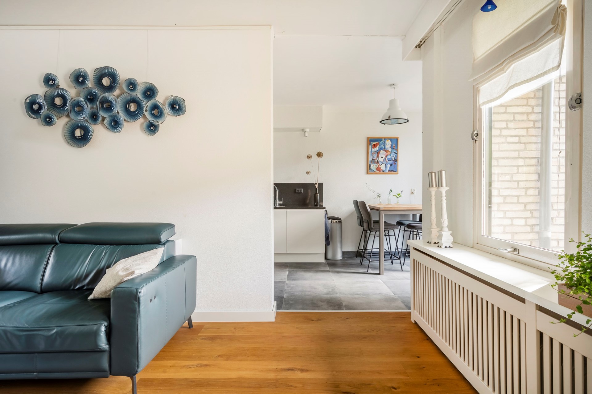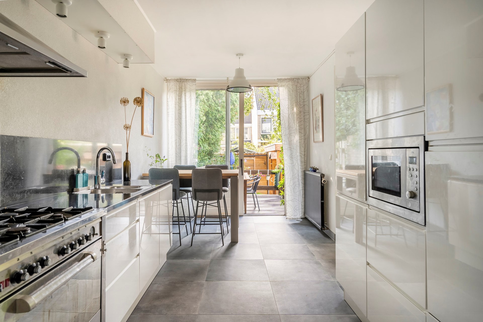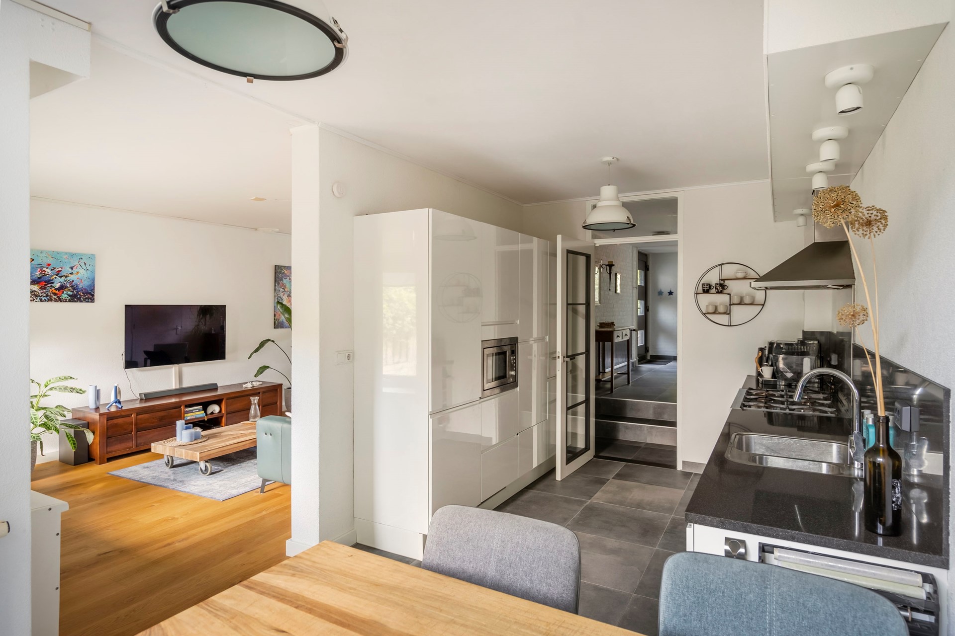 Bij binnenkomst in de keuken en woonkamer valt direct de ruime opzet op. Het vele licht dat door de grote ramen naar binnen komt, versterkt het ruimtelijke gevoel. De leefkeuken is een fijne ruimte om in te koken en zitten. Via de schuifpui loop je naar buiten waar, als een verlengstuk van de eetkamer, een terras is gemaakt waar je heerlijk kunt zitten en eten met het hele gezin. De keuken heeft verder alle benodigde inbouwapparatuur. Handig: de vaatwasser is op hoogte gemaakt.