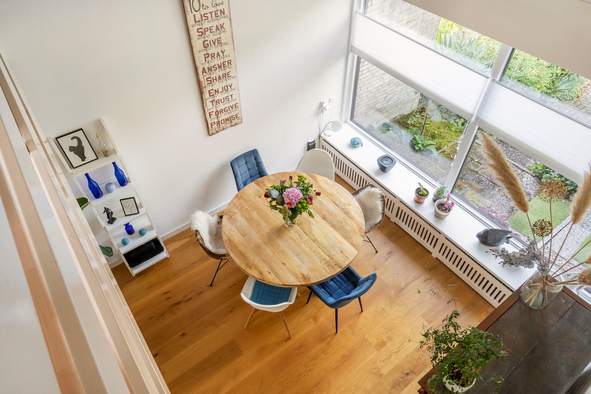 De woonkamer heeft een warme uitstraling dankzij het eiken parket en biedt genoeg ruimte voor gezellige avonden met familie en vrienden. Het bijzondere aan deze ruimte is de hoge vide, aan de voorzijde.