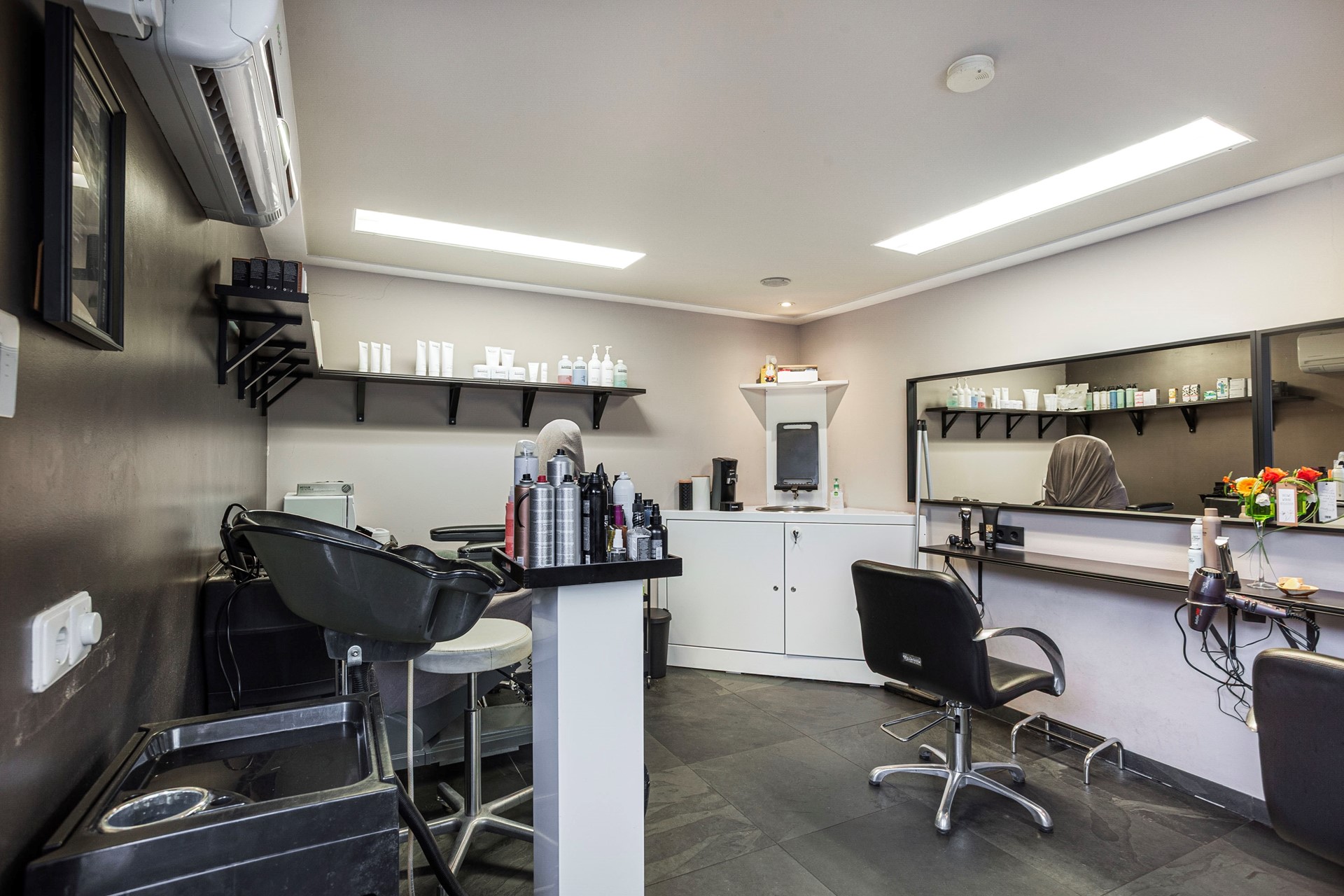 Via de tuin is de aparte salonruimte bereikbaar: een volledig afgewerkte praktijk met eigen entree, isolatie, vloerverwarming, airco en water-/stroomvoorziening. Deze ruimte heeft een officiële vergunning (aantoonbaar) en is perfect als kapsalon, schoonheidssalon of kantoor aan huis- en kan desgewenst eenvoudig bij de woonruimte worden betrokken.