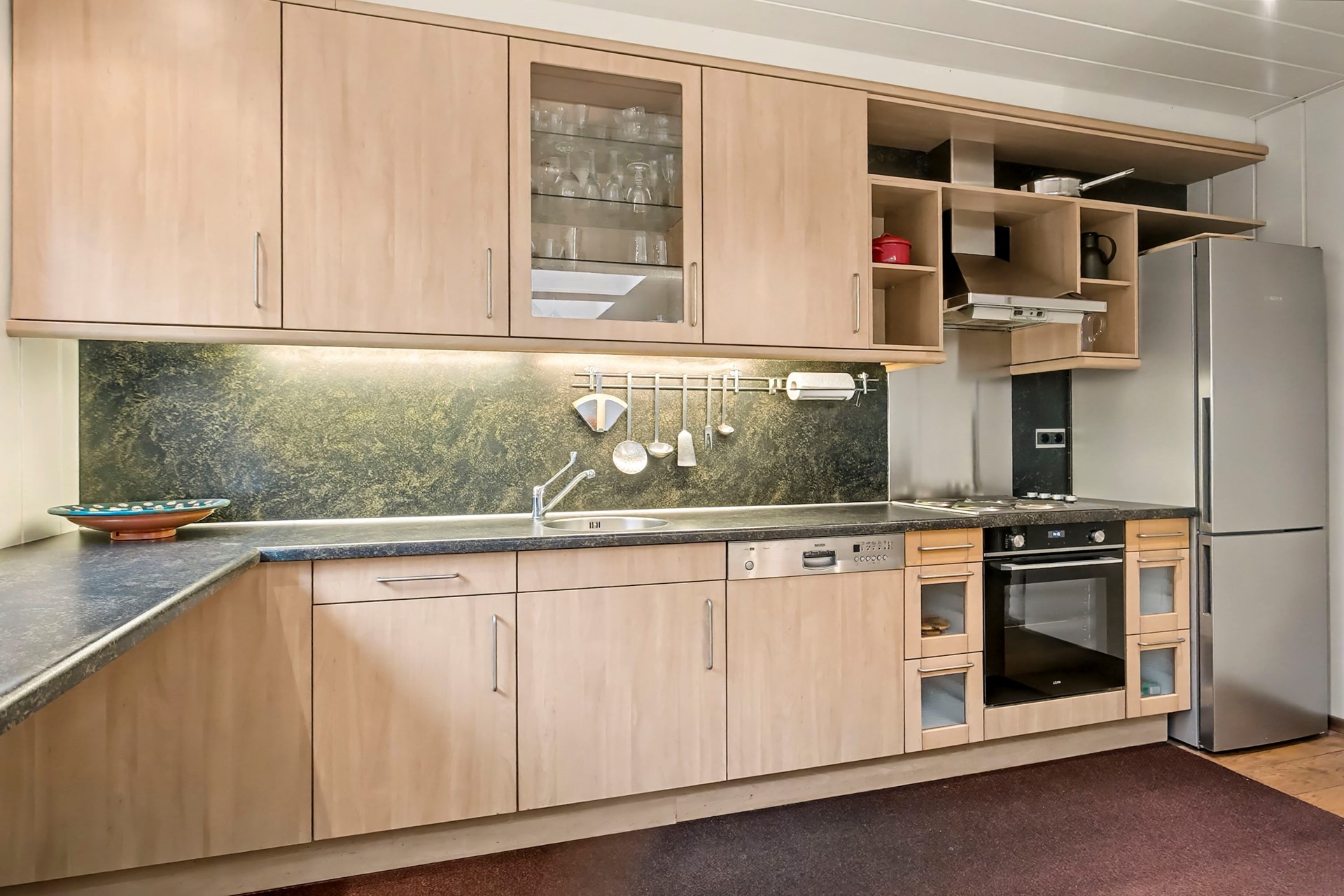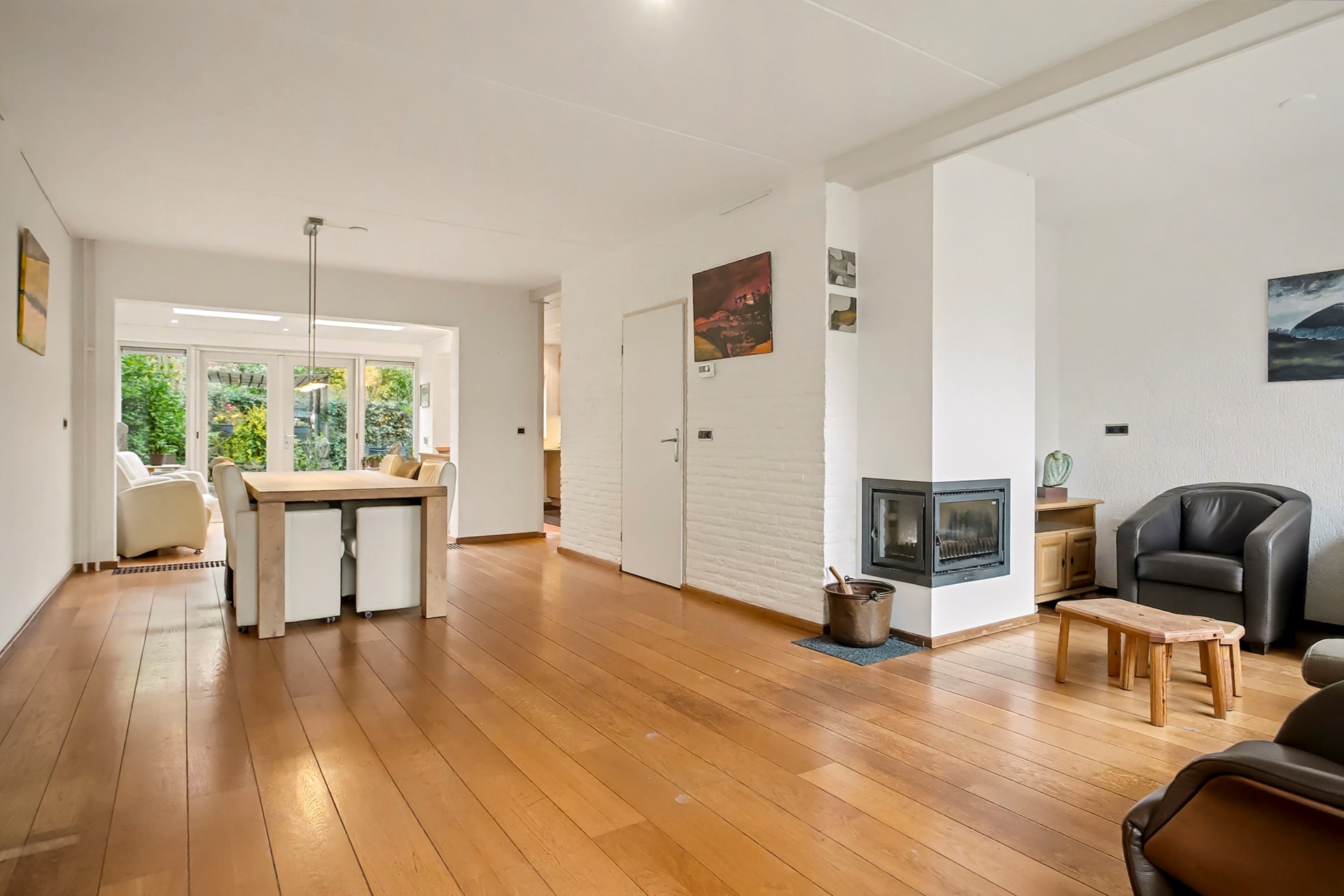 Bij binnenkomst valt meteen de ruime opzet op. De uitgebouwde woonkamer heeft een gezellige zithoek en een eetgedeelte. Het zijn fijne plekken om te ontspannen en te tafelen. De grote ramen aan de voorzijde zorgen voor veel natuurlijk licht en de houtkachel geeft een gezellige sfeer. Aan de achterzijde is de halfopen keuken, die praktisch is ingericht en voorzien van inbouwapparatuur. Hier kook je met gemak de lekkerste maaltijden. Vanuit de uitbouw stap je de tuin in.